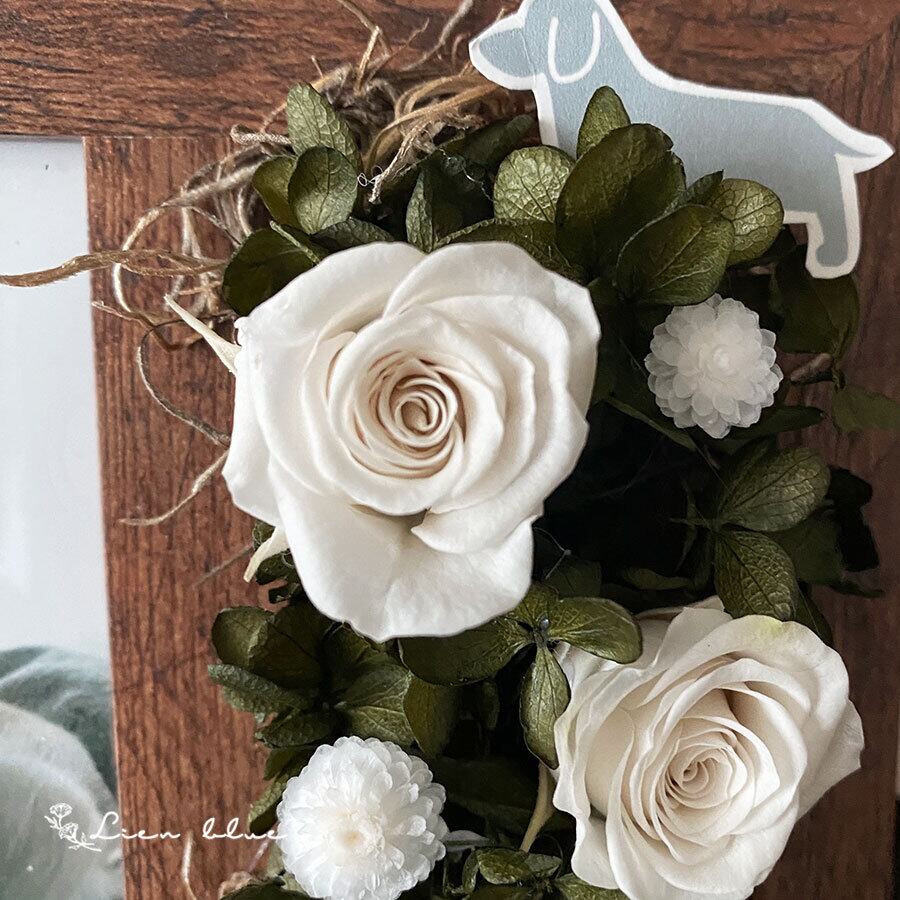 フォトフレーム 写真 ペット プリザーブドフラワー ネーム 印刷 誕生日 仏花 お仏壇 お供え 薔薇 紫陽花 枯れない花 お彼岸 お供え 花 お彼岸 一周忌 法事 | Lien*Fleuri | 小さなお花屋さん*リアンフルリ