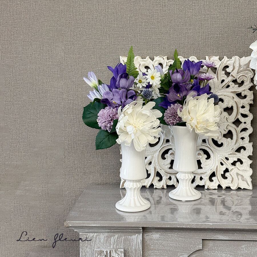 落ち着きあるパープルと清らかなホワイトの花々が調和し、シンプルでありながら品格を感じさせるデザインは、どんな空間にも静かに溶け込みます。